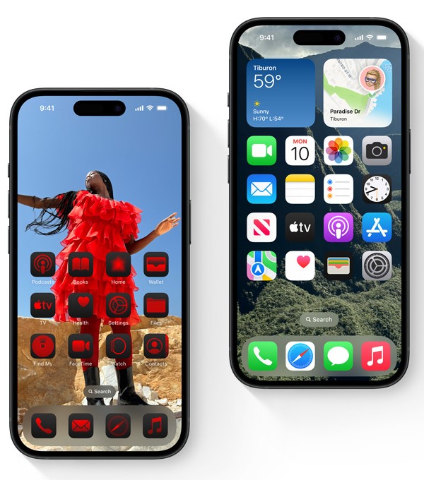 먼저 홈화면에서 안드로이드처럼 앱이나 위젯을 원하는 위치에 배치할 수 있게 되었다. 또한 앱 아이콘을 라이트모드, 다크모드, tinted (색조 효과) 등을 통해 커스터마이징 할 수 있게 바뀌었다. 다만 tinied의 경우 아이콘 전체의 색상이 지정한 색으로 변경되다 보니 앱 구별에 어려움이 있다는 점에서 호불호가 갈릴 수 있겠다.